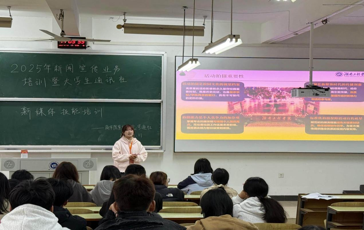 在主校区D202教室举办新闻宣传业务培训会。培训邀请湖南工程学院党委宣传部杨欢老师、学通社策划中心副社长赵兴圆同学分别讲授新闻写作要领与新媒体拍摄表达技巧,老澳门六合彩官网