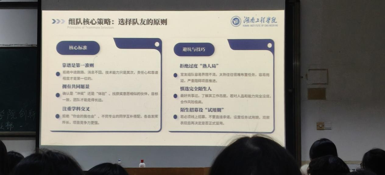 在团队组建环节,胡梦涵分享了导师与队友选择的双重实用技巧,并通过案例阐释了团队四大核心角色分工:负责人统筹全局、技术核心提供专业支撑、文案策划负责项目书撰写、美工设计主导PPT视觉优化,助力同学们高效搭建优质团队。
