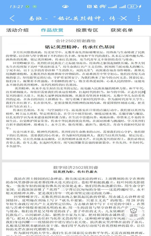 本次活动采用线上作品征集、优秀作品展示、大众投票评选的形式开展,得到了全院同学的积极响应与广泛参与。参赛同学紧扣活动主题,立足青春视角,结合自身学习感悟与思想体会,创作了一批内涵深刻、情感真挚、形式多样的优秀作品,生动展现了新时代青年对革命先烈的崇高敬意与深切缅怀,深刻诠释了青年学子对红色精神的理解与传承。